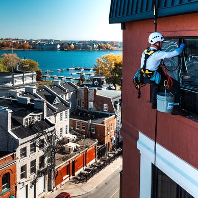 Our experienced rope access technicians safely clean windows on buildings of any height. With a mature, professional team, we make safety our top priority and follow all regulations rigorously.